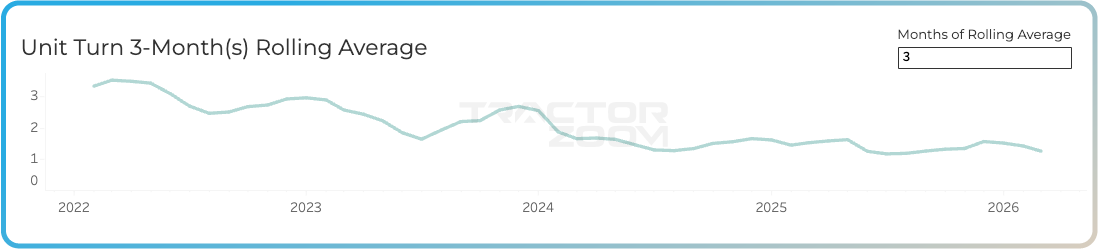 The turn rate eased to 1.8, off about 4% from last month but flat year over year. This is still the highest absolute turn rate of any category tracked, reflecting the urgency of planting-season demand. With corn and soybean acreage decisions largely locked in and commodity prices steady, this seasonal window is likely to sustain momentum through April before tapering.