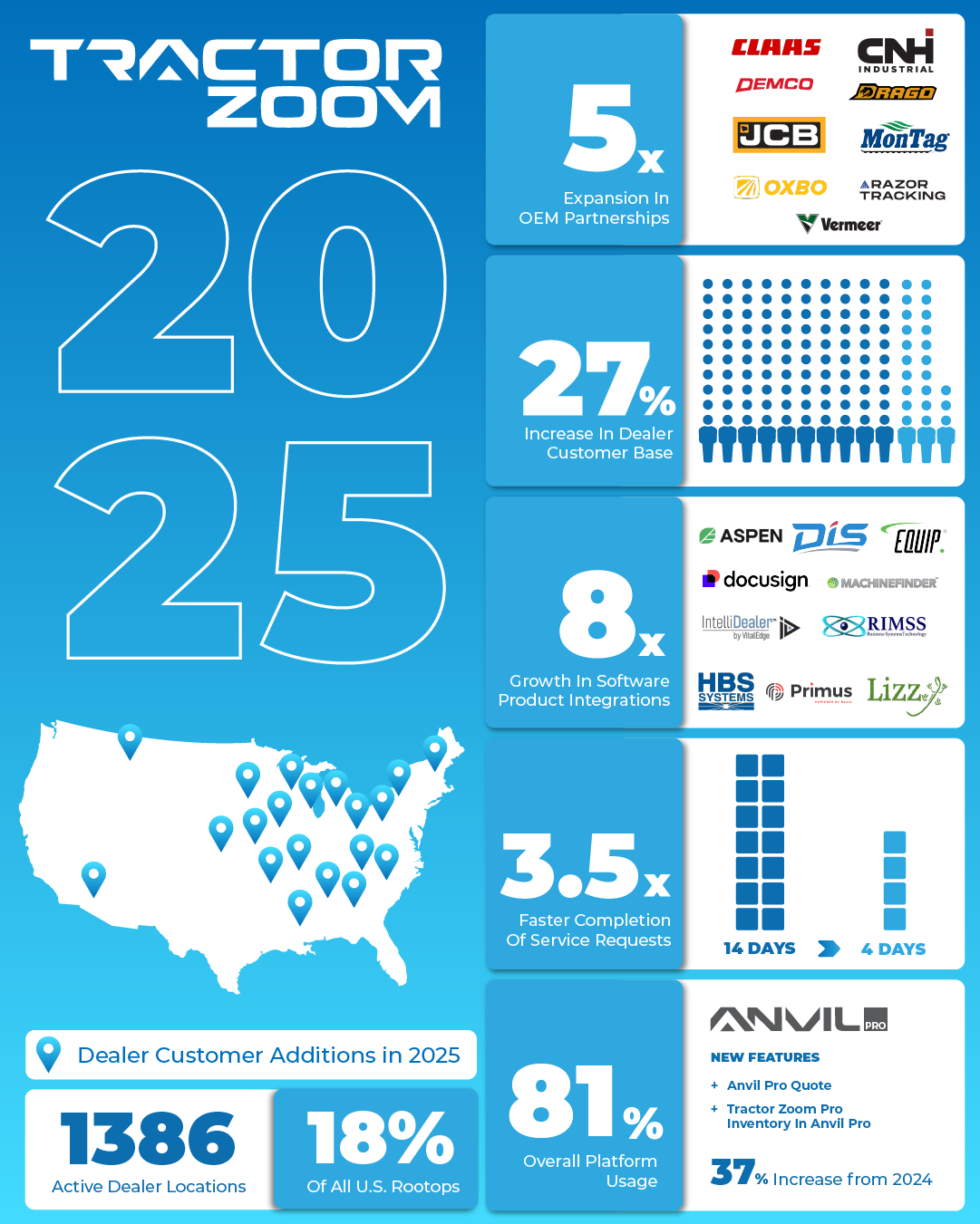 27% growth in dealer organizations using the Tractor Zoom Suite since 2024, now representing 1,386 active dealer locations across North America.